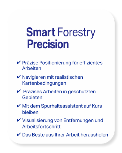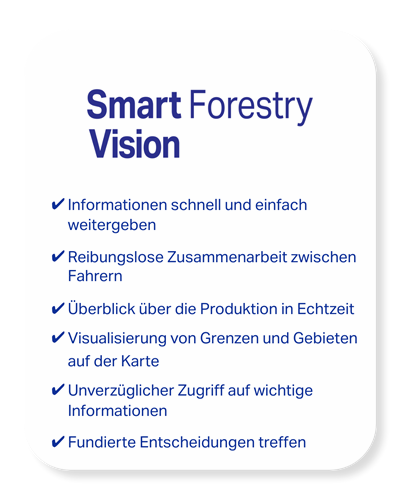 Smart Forestry bietet Ihnen Zugang zu einer Sammlung digitaler Dienste, die den Arbeitsplatz in Ihrer Forstmaschine sicher, intelligent, produktiv und nachhaltig machen. Egal, ob Sie eine oder hundert Forstmaschinen haben - Sie behalten den Überblick, arbeiten effizient mit Kollegen zusammen und haben Zugriff auf eine Datenbasis, die Ihren Alltag erleichtert. Sie können Ihren Bedarf an digitalen Diensten flexibel anpassen.